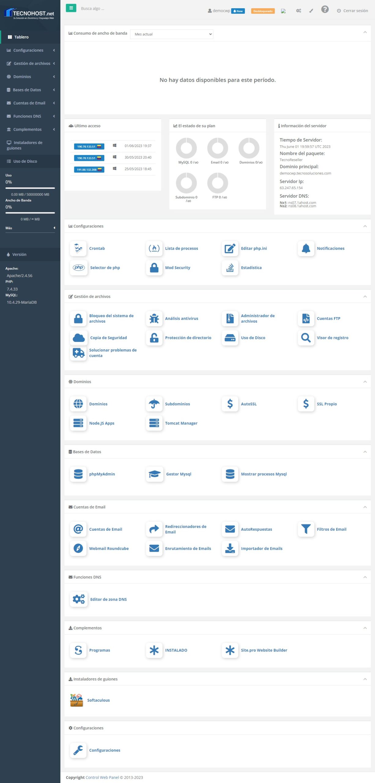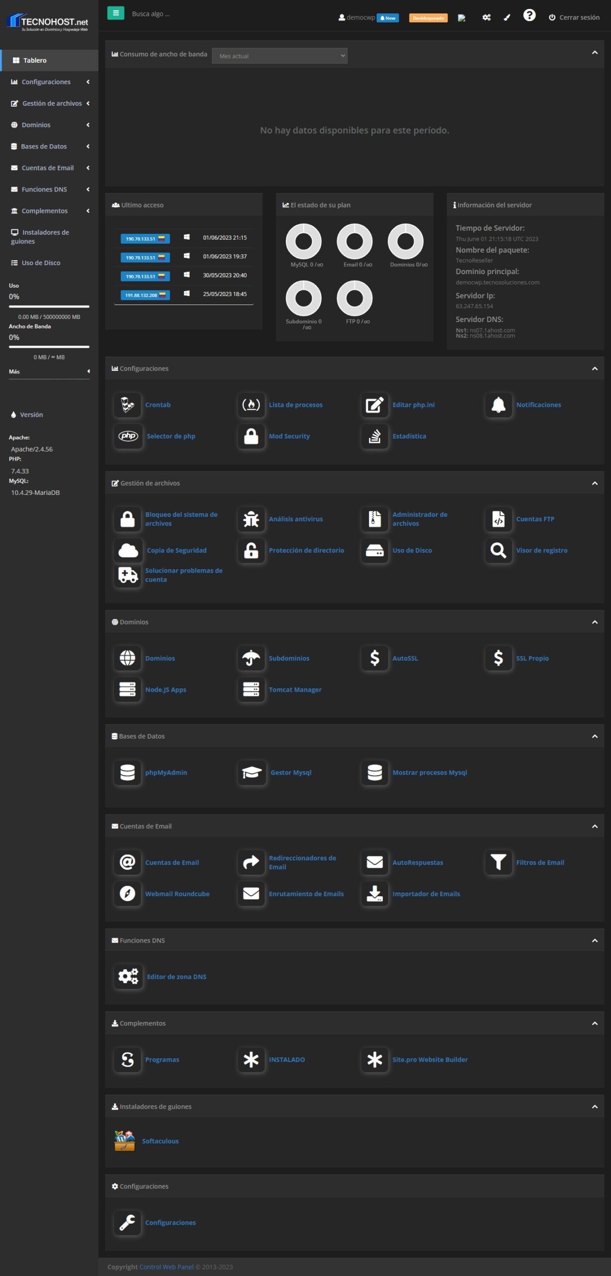 Aquí podrás consultar estadísticas de servicios, procesos, configuraciones de respaldo, dominios, subdominios, edición de archivos como php.ini, phpversions, administración de base de datos, zonas DNS, instalación de paquetes como WordPress, Prestashop, Joomla, Drupal, configuración de Cron temporizado tareas, certificados CSS, cuentas FTP, entre otros.