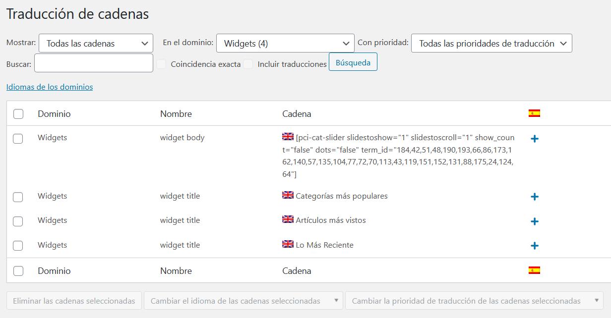 WPML permite traducir fácilmente los widgets desde la pantalla de Traducción de cadenas. Para ello, es necesario instalar el módulo de Traducción de cadenas de WPML. Este módulo se encuentra disponible en el tipo de cuenta TecnoCMS Multi-Idiomas.