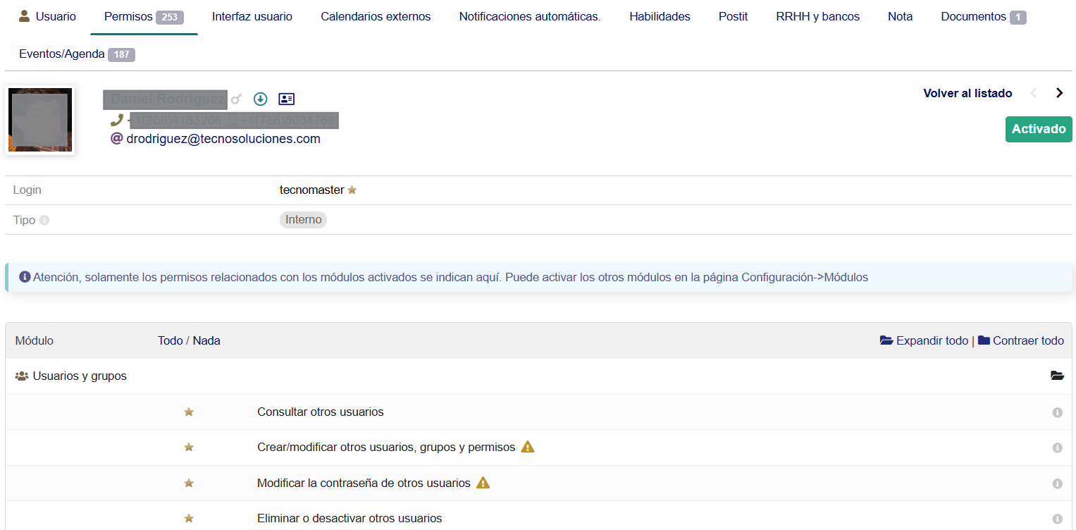 También, es necesario asignar los permisos correspondientes a los distintos usuarios del TecnoERP, de esta forma, se evitan accesos a información privada o acciones no permisivas (validación de facturas, cerrar presupuestos, etc.).