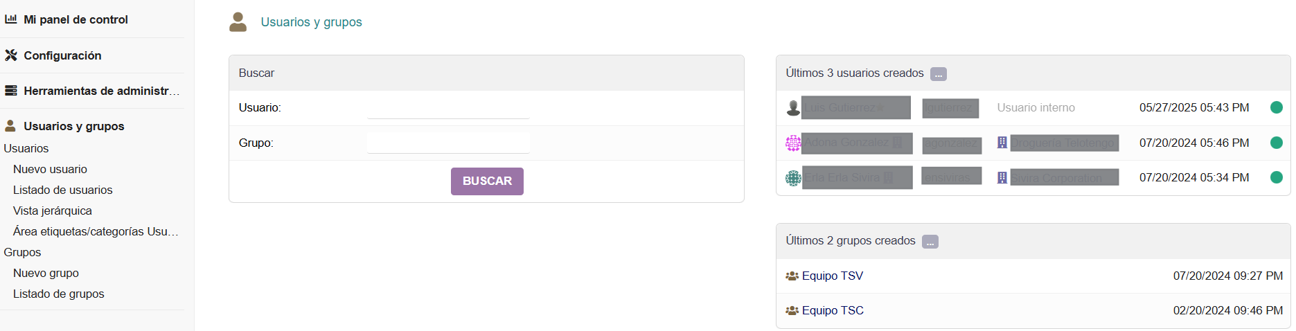Como se aprecia en la imagen, se presenta en el centro un recuadro para buscar Usuarios, y de lado derecho un reporte con los Usuarios y Grupos creados más recientemente. Cada uno de los nombres tienen un enlace que permite ir directamente a los datos correspondientes, bien sea para su revisión o para Enviar e-mail, Modificar, Copiar, Generar nueva contraseña, Enviar nueva contraseña, Desactivar y Eliminar. A su vez, al ingresar en el registro de un Usuario, este dispone de un menú individual con: