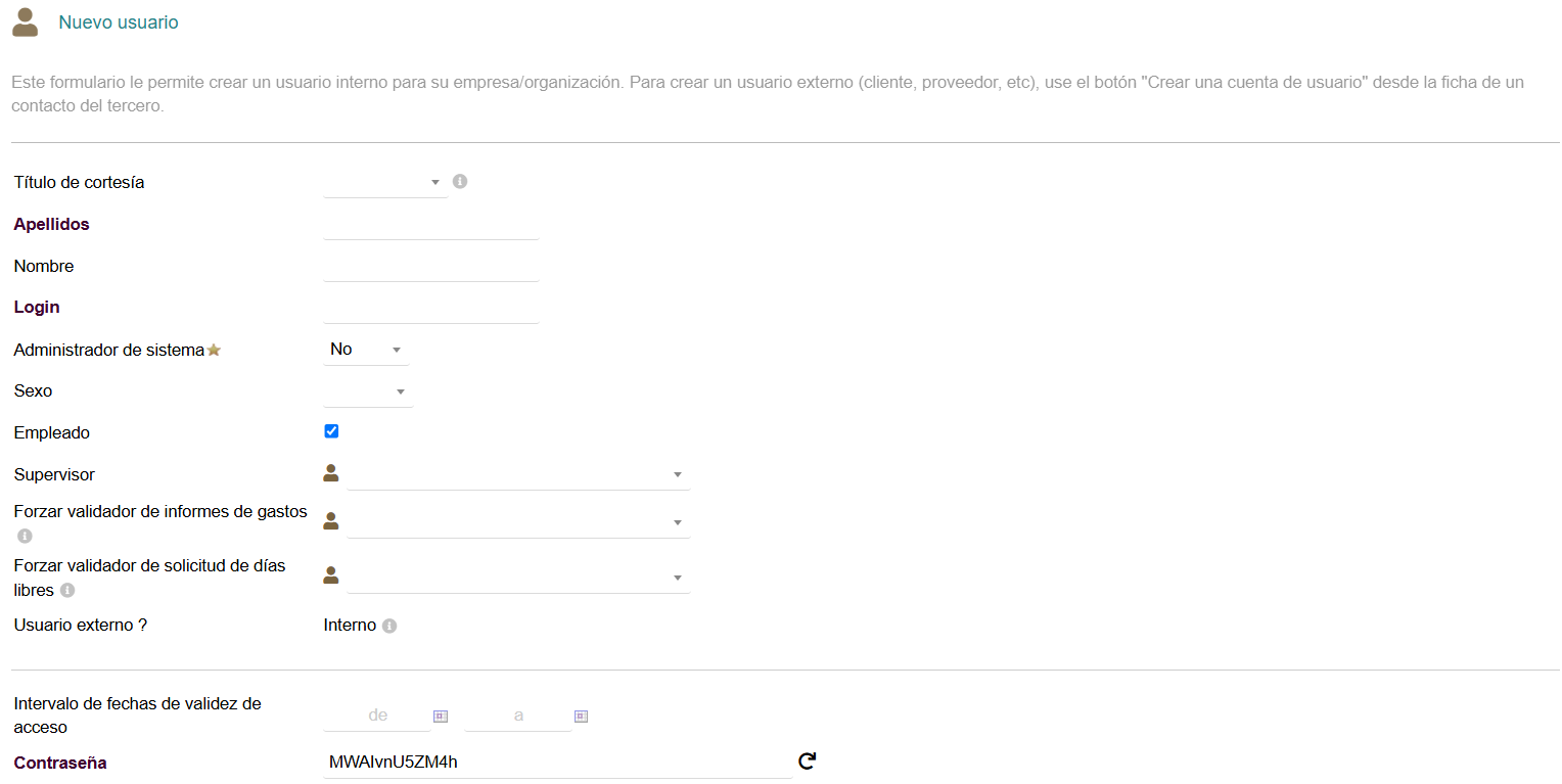 Debe prestarse atención a la opción del tipo de Usuario y si éste es externo (ej.: personal contratado, consultor) o interno (ej.: trabajador en nómina) de la empresa. Tenga en cuenta que si se define como Administrador de sistema, éste será capaz de entrar a todas las herramientas del TecnoERP. En particular, podría modificar las cuentas de los otros usuarios.