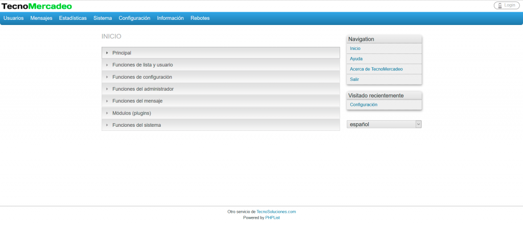 Si su nombre de usuario y su contraseña son válidos se presentará la página principal, de no ser así, se presentará nuevamente la página de ingreso, añadiendo el mensaje de “Error al Ingresar” encima del nombre de usuario. Una vez que usted ha ingresado con éxito, se mostrará la página principal de TecnoMercadeo, donde son realizadas la mayoría de las operaciones del sistema TecnoMercadeo.