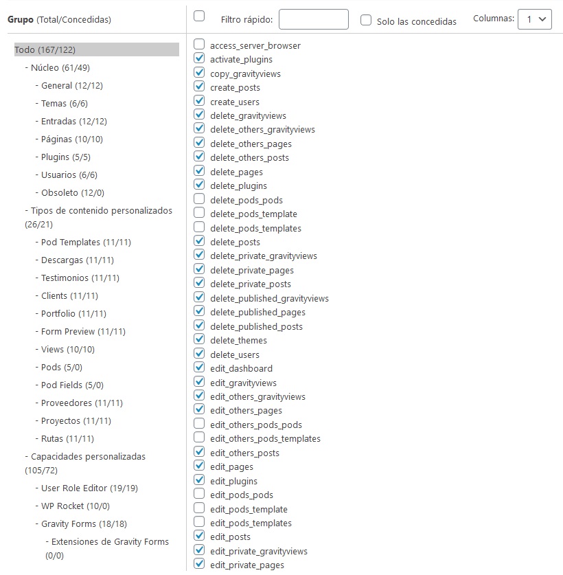 Al darle clic, nos mostrara una vista con todas las funcionalidades que podemos restringir dentro de cada módulo de nuestra plataforma.