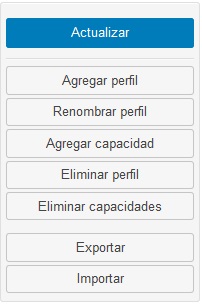 En la parte derecha de la pantalla nos aparece un pequeño menú con los siguientes botones: Actualizar, Agregar perfil, Renombrar perfil, Agregar capacidad, Eliminar perfil, Eliminar capacidades, Exportar e Importar.