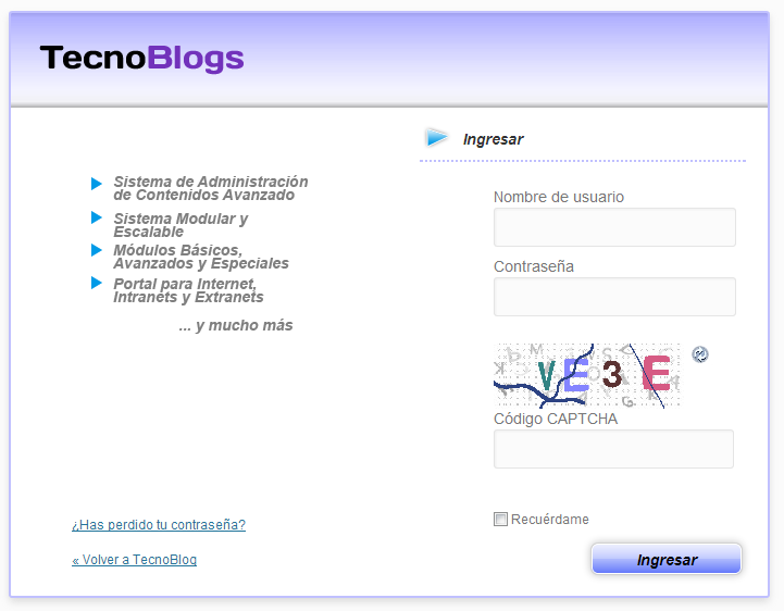 - Escriba su nombre de usuario de TecnoCMS en el campo “Nombre de usuario”.