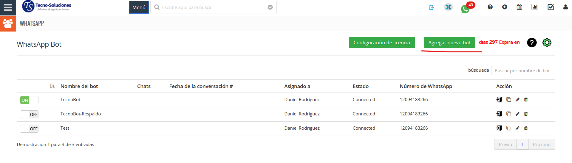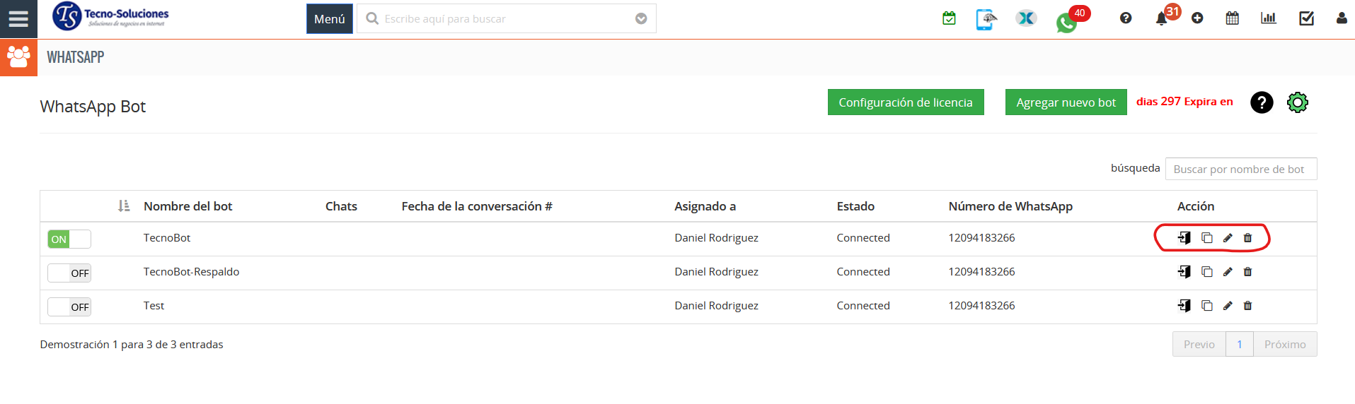 - Los usuarios pueden editar, duplicar y eliminar WhatsApp Bot haciendo clic en los iconos relacionados.