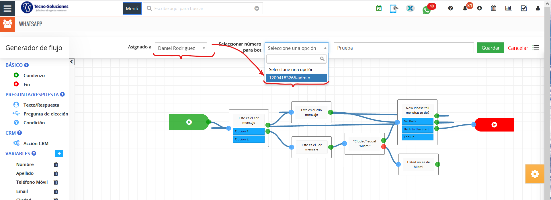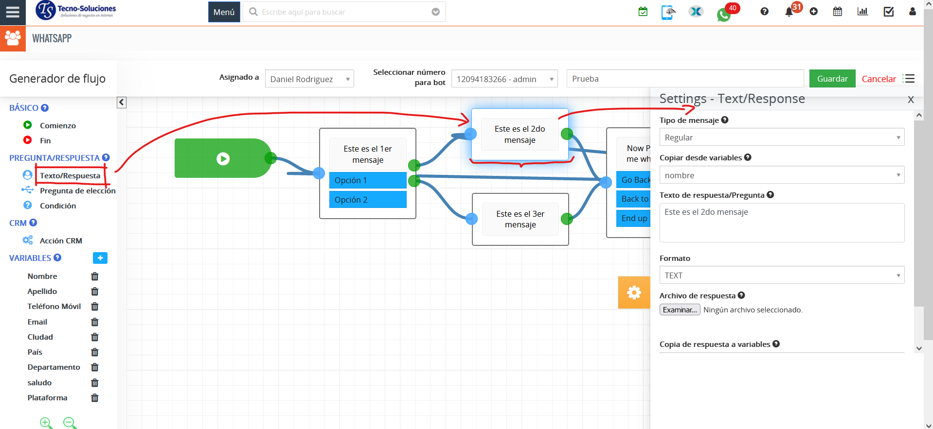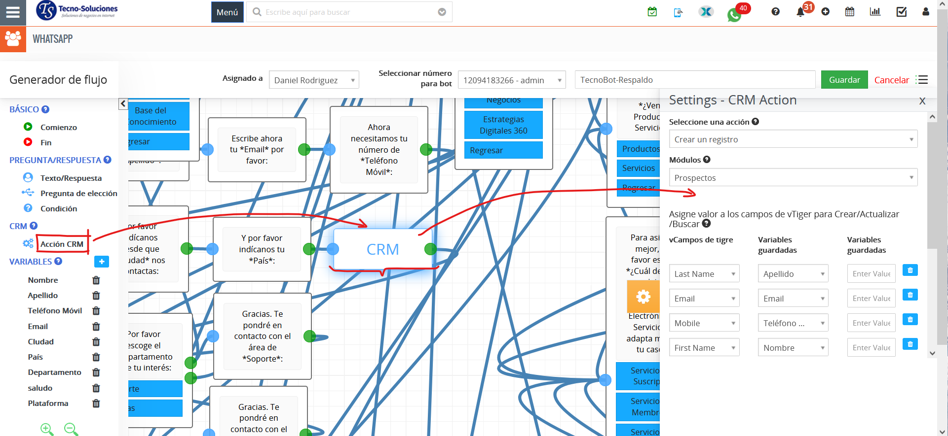 - Guardar variable (Respuesta) del campo TecnoCRM: al crear/actualizar/buscar en CRM, devolverá el valor del campo seleccionado al cliente para que se muestre en el bot de WhatsApp.