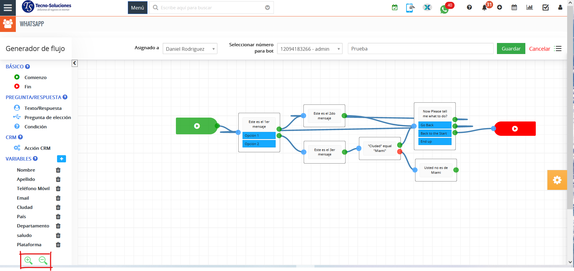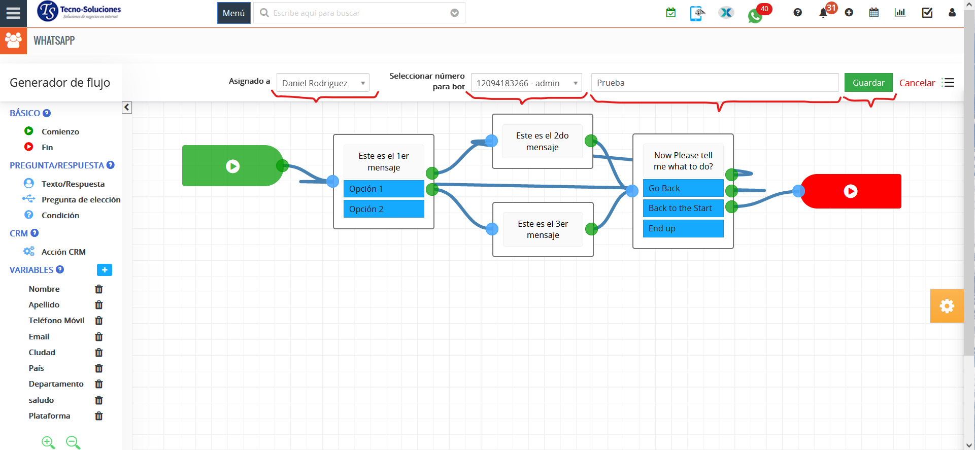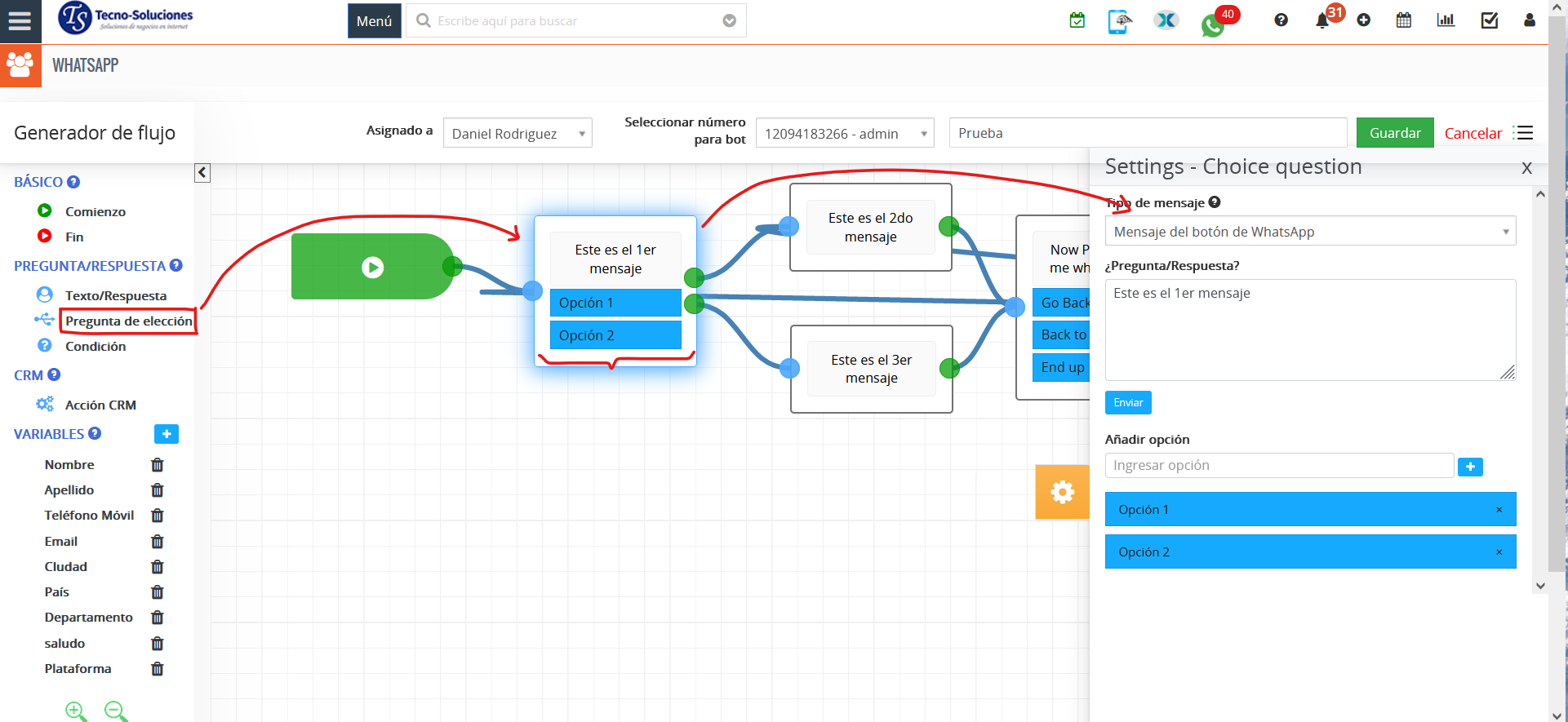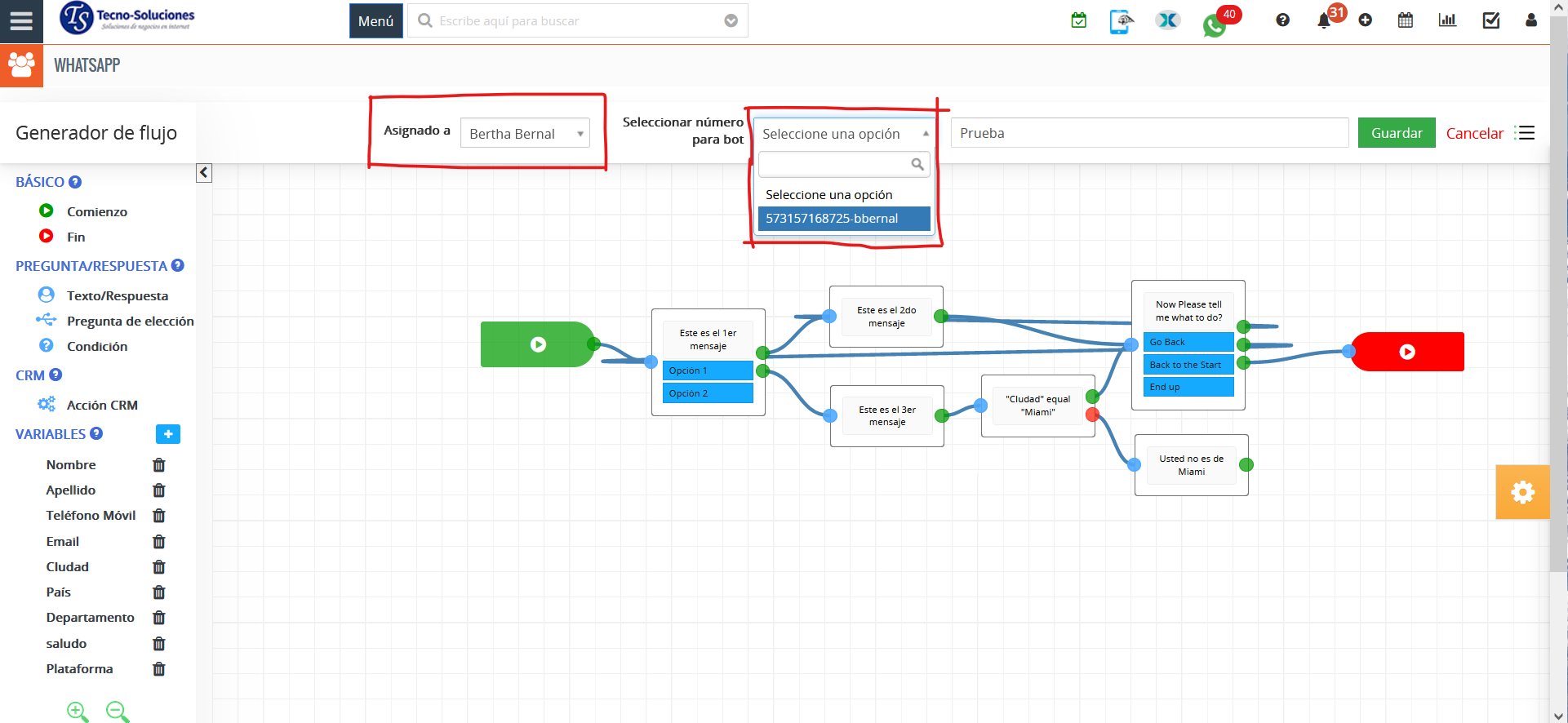 - Guardar variable (Respuesta) del campo TecnoCRM: al crear/actualizar/buscar en CRM, devolverá el valor del campo seleccionado al cliente para que se muestre en el bot de WhatsApp.