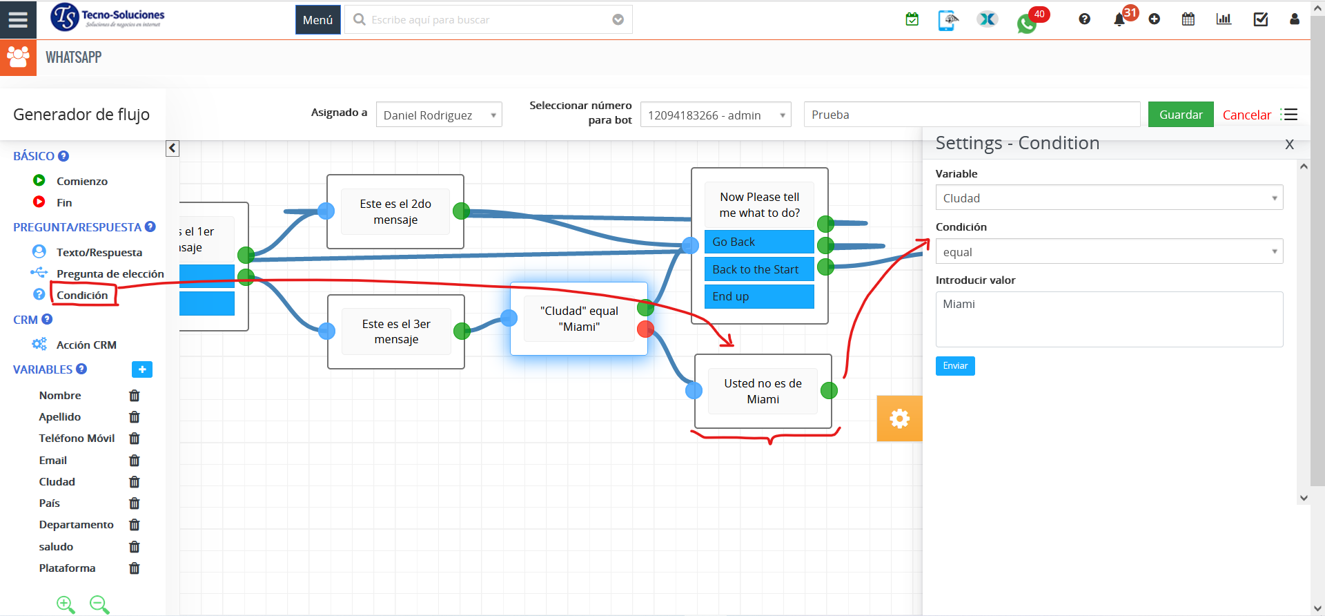 - Agregue Condición para compararla con una respuesta de un cliente en Bot.