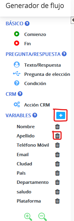 Las variables utilizadas para copiar las respuestas de los clientes que utilizan bots como su nombre, correo electrónico, teléfono, etc. Esto se utilizará para mapear con los campos de CRM respetados para Agregar/Buscar/Actualizar a o desde CRM.