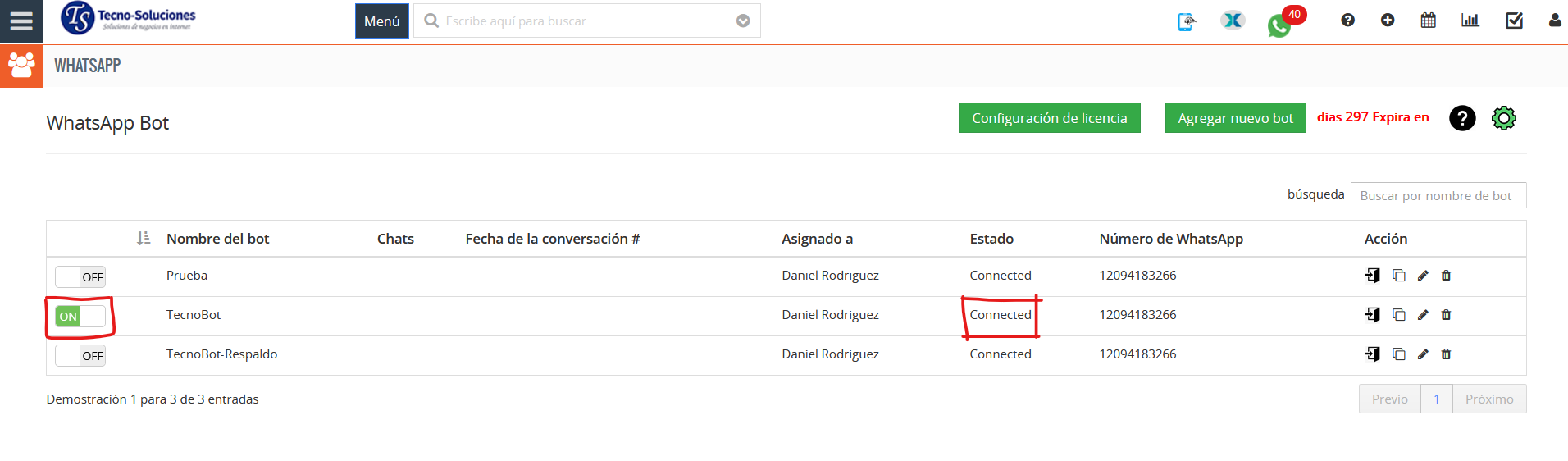 - Habilite Bot para el número de WhatsApp conectado.