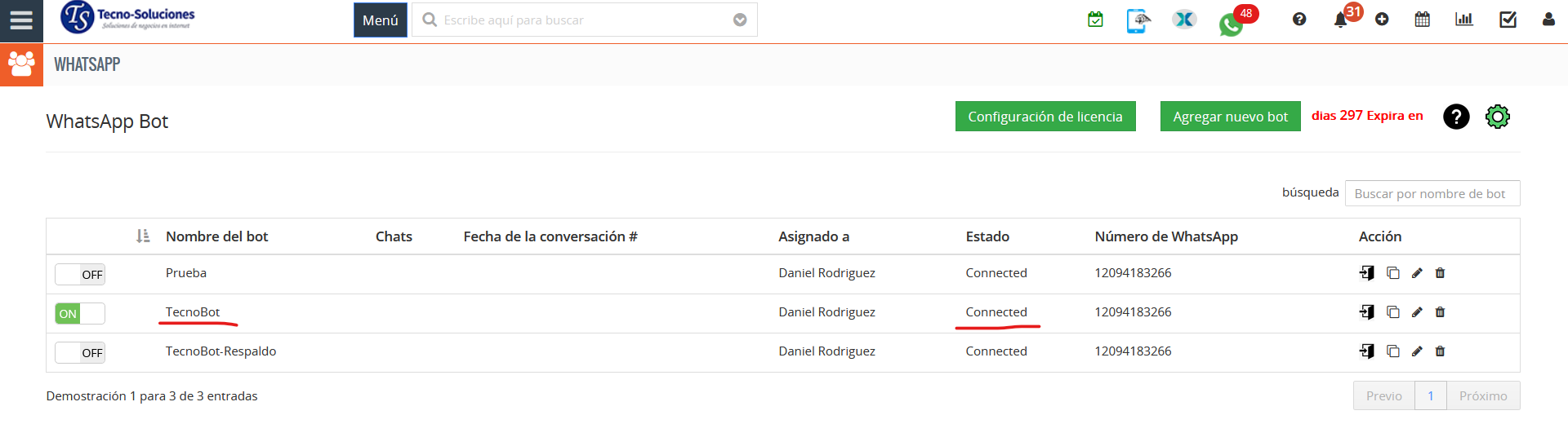 - Active “Bot de soporte” para conectar su número de WhatsApp.