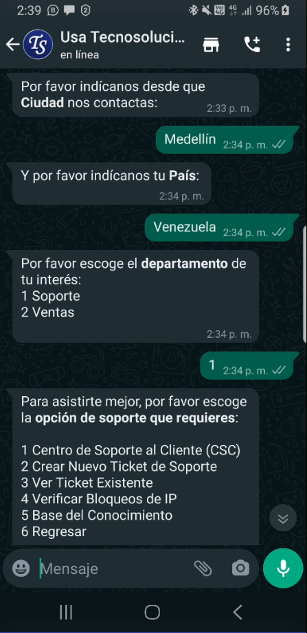 - Si selecciona “Crear nuevo ticket de soporte” ingresando el número como 2, se le pedirá que describa su inquietud.