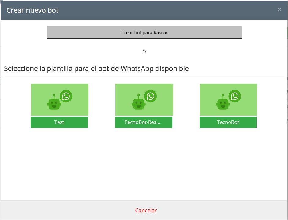 - Puede utilizar plantillas predefinidas que ofrece el equipo de TecnoCRM para WhatsApp. Tiene 2 opciones: Crear bot desde cero o Seleccionar plantilla para el bot de WhatsApp disponible.