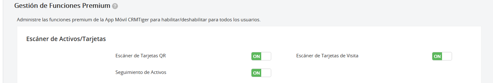 - Para permitir que los usuarios accedan a QR/escáner de tarjetas y seguimiento de activos, active o desactive las siguientes opciones: