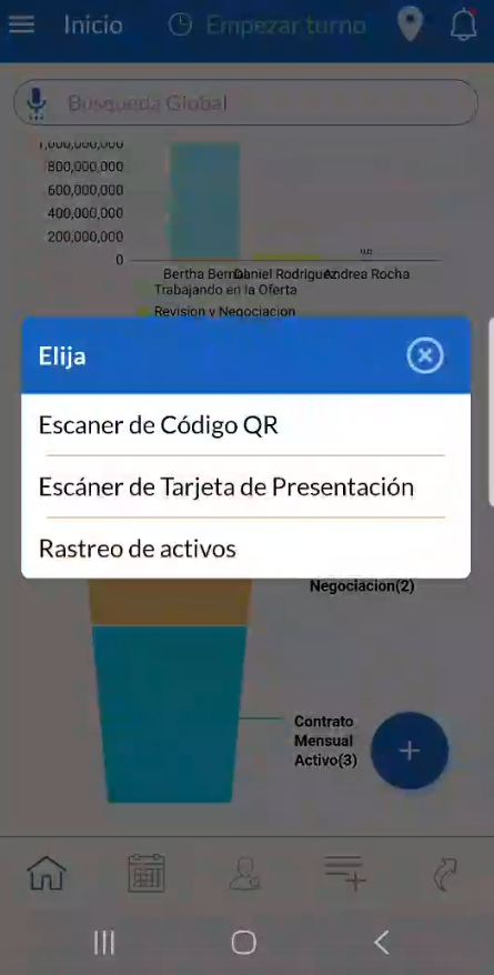 Escáner de tarjetas: Esta función permite a los usuarios escanear activos como tarjetas de presentación, códigos QR, códigos de barras de productos o ID de productos que se pueden agregar como clientes potenciales/contactos/oportunidades.