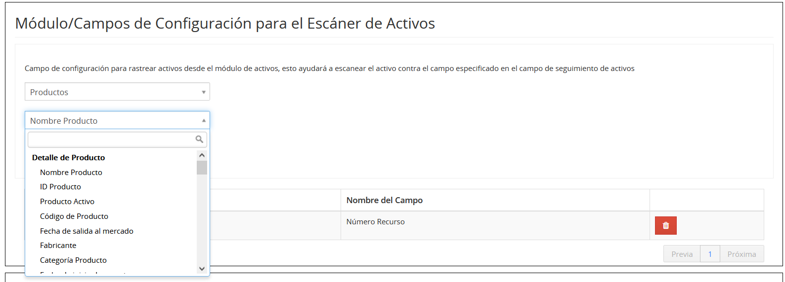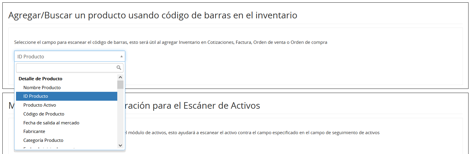 Esta función permite a los usuarios administradores configurar el campo de productos para el escaneo de códigos de barras, como el número/ID del producto, el nombre del producto, el número de pieza, etc. para agregar al inventario.