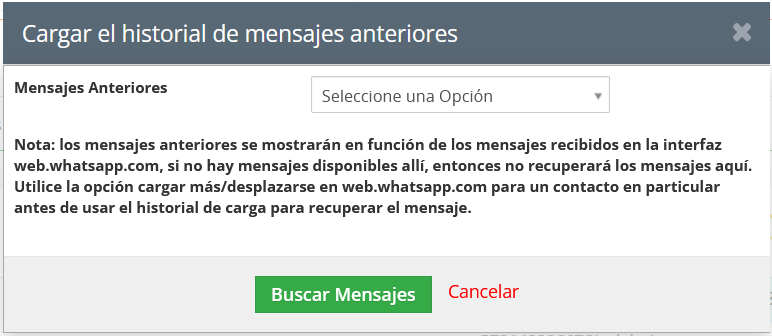 - La función “Cargar historial de mensajes anteriores” de la integración de WhatsApp puede permitir cargar el historial de mensajes anteriores para fechas seleccionadas y números de WhatsApp seleccionados, lo que solo recupera mensajes que no recuperan archivos adjuntos.