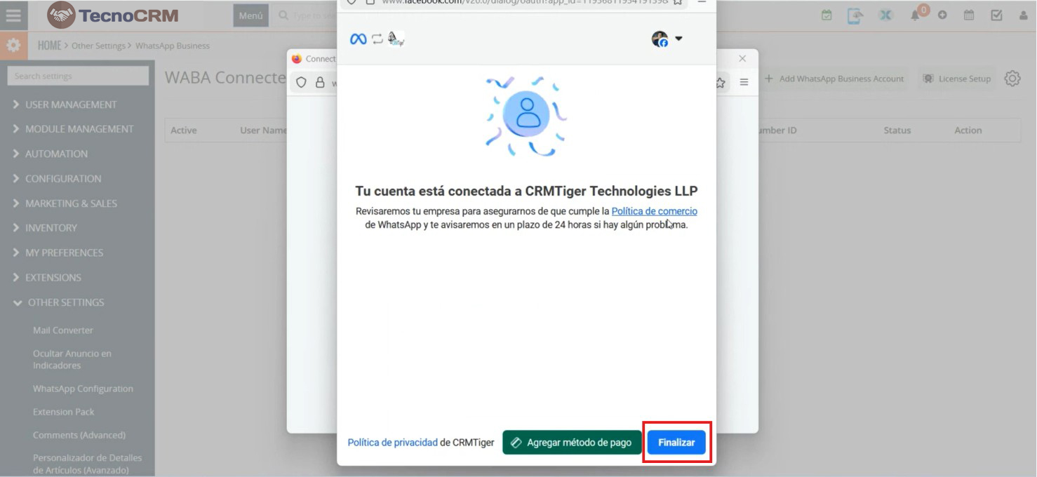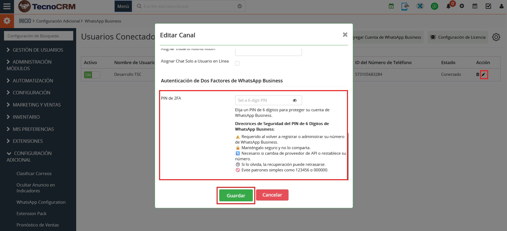 El usuario debe ingresar el PIN 2FA de 6 dígitos para conectar con éxito su cuenta de WhatsApp Business al CRM, como se muestra en la siguiente captura de pantalla.