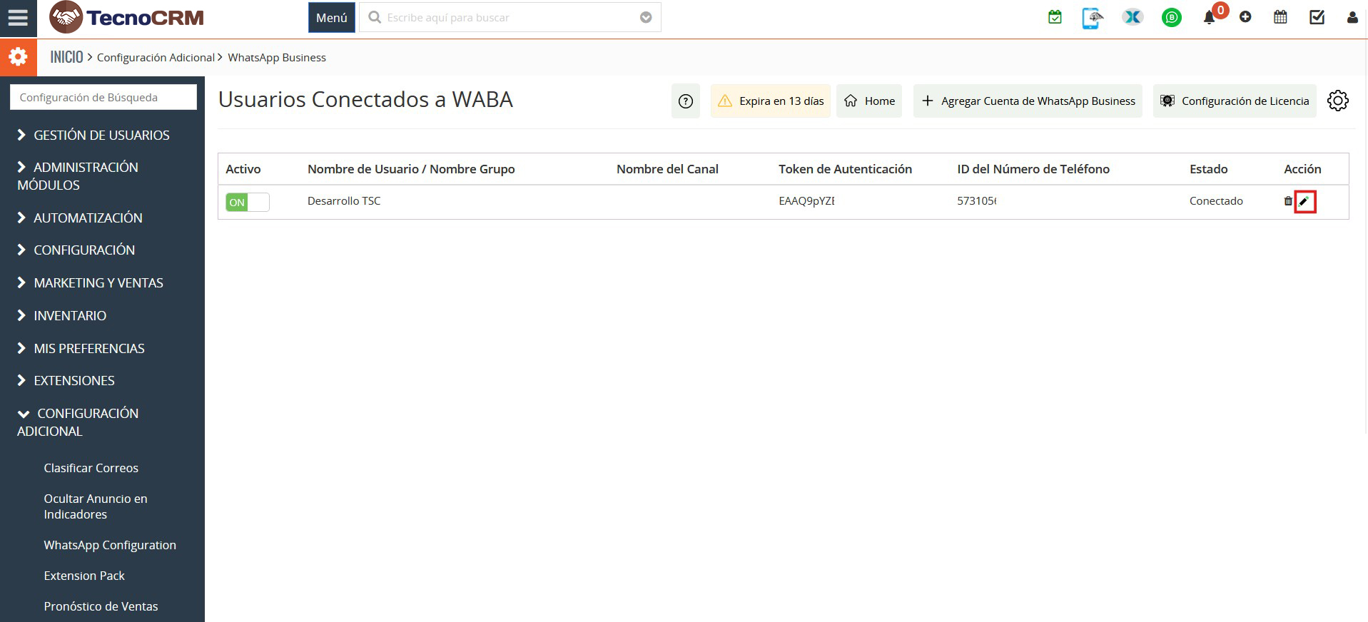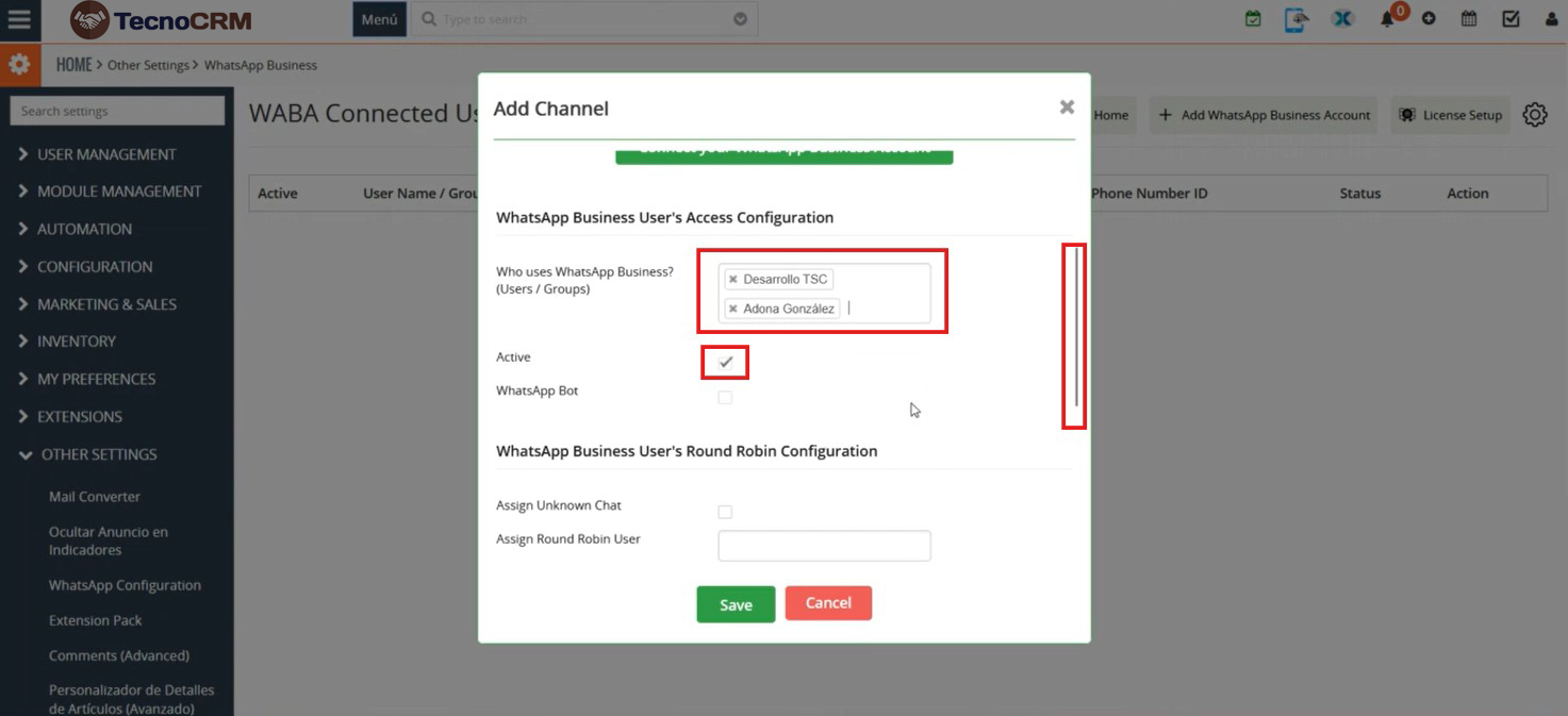 Si quiere volver a editar más adelante el usuario, navegue nuevamente en las opciones laterales: Otras configuraciones > Configuración de WhatsApp Business > Elija el usuario que quiera editar haciendo clic en el icono de editar (lápiz).