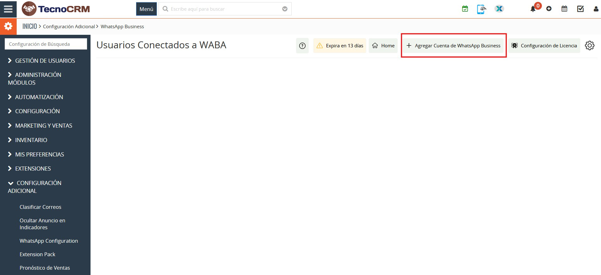 Para empezar, haz clic en “Configuración Adicional”/ “Otros ajustes” > “Configuración de WhatsApp Business” > “Añadir cuenta de WhatsApp Business” para configurar una cuenta.