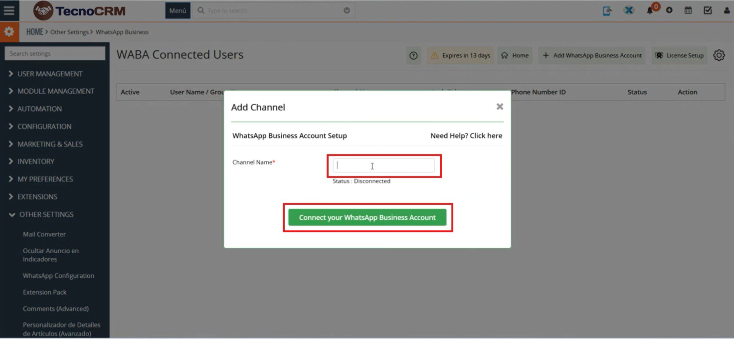 Al hacer clic en el botón “Añadir cuenta de WhatsApp Business”, se abrirá la ventana emergente donde el usuario debe ingresar el nombre del canal deseado y hacer clic en “Conectar su cuenta de WhatsApp Business”.