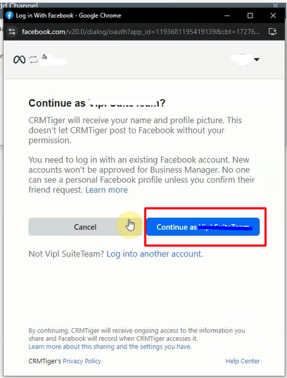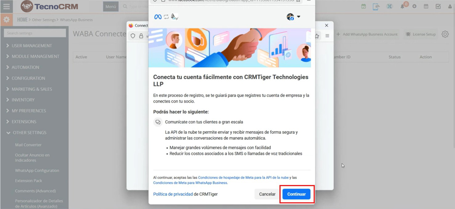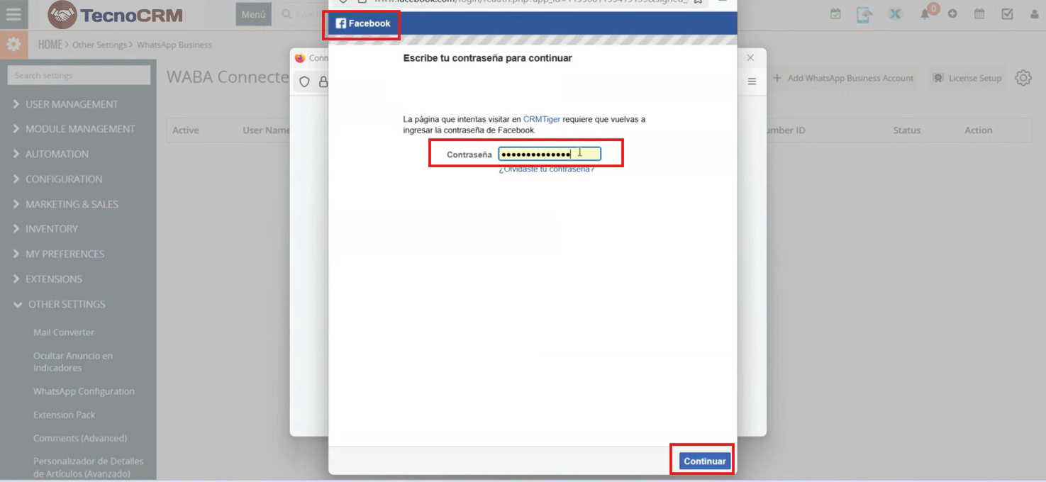 Como se muestra en la siguiente captura de pantalla Después de hacer clic en el botón ‘Conectar su cuenta de WhatsApp Business’, navega a la página de la cuenta de Facebook, donde el usuario debe ingresar su contraseña y hacer clic en el botón continuar para iniciar sesión en Facebook.