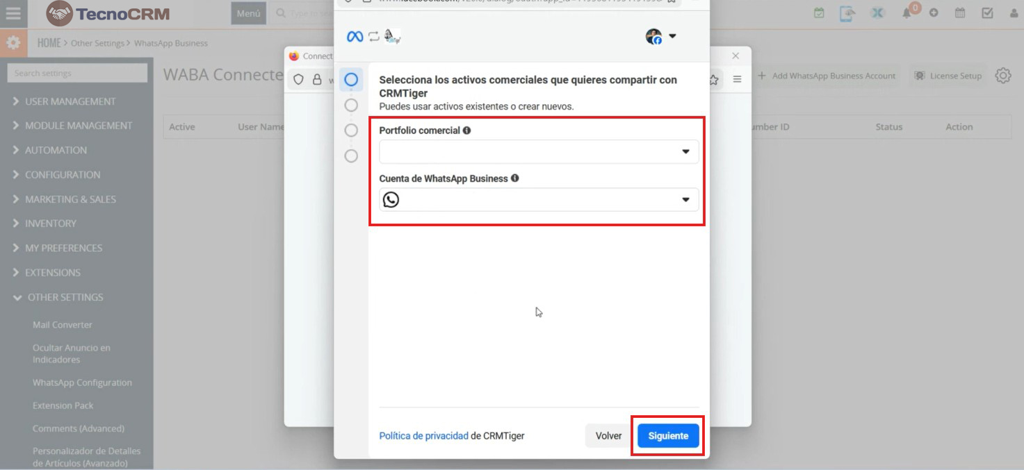 En la página siguiente, el usuario debe crear o seleccionar una cuenta de WhatsApp Business, como se muestra en la captura de pantalla, y luego hacer clic en el botón ‘Siguiente’.