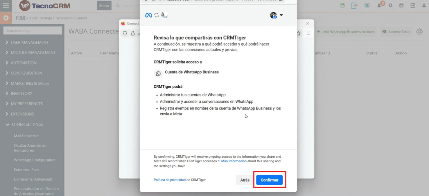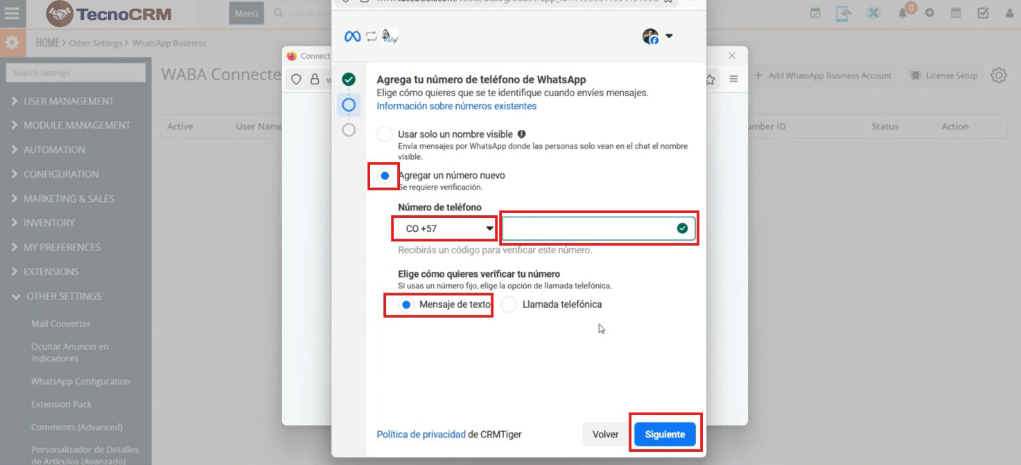 Después de completar la configuración, recibirás un mensaje o llamada de Facebook Business en tu aplicación WhatsApp Business según lo que hayas seleccionado. Coloque el código de verificación enviado al número registrado en su cuenta para finalizar el proceso de vinculación. Esta acción completa la autenticación y conecta de forma segura tu Cuenta de WhatsApp Business con TecnoCRM.