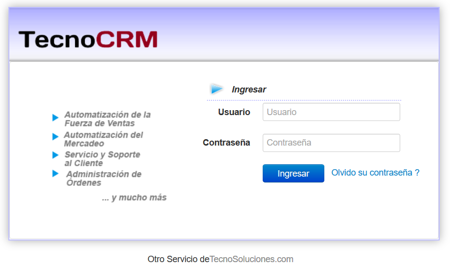 El navegador permite grabar sus datos de acceso para que no sean solicitados constantemente cuando ingresa por primera vez, sin embargo, no es recomendado grabar esta información en el PC debido a que si un tercero tiene acceso al mismo también podría ingresar al sistema TecnoCRM.