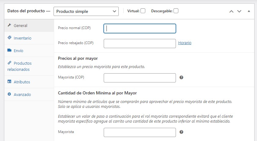 Los precios mayoristas en la plataforma brindan una opción para agregar un precio mayorista fijo a sus productos individuales. Esto se puede encontrar en la configuración de la página de su producto.