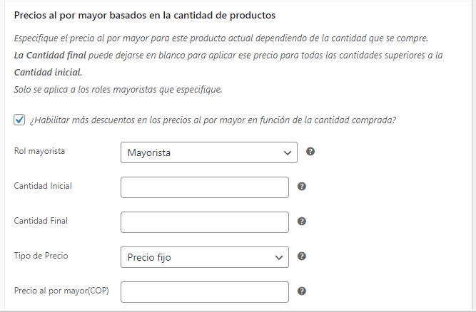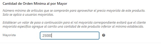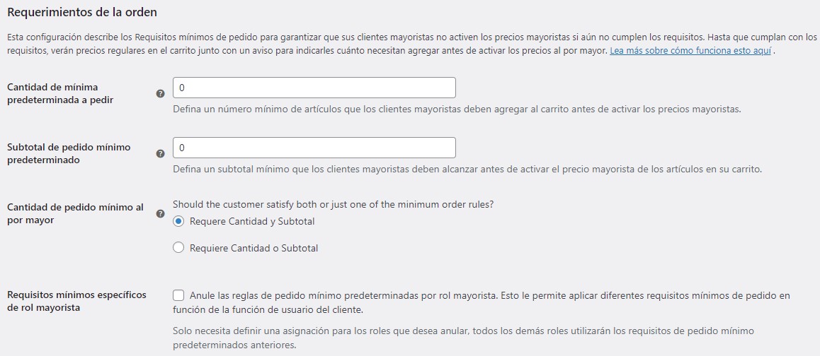 Cantidad mínima de pedido predeterminada: defina una cantidad mínima de artículos que los clientes mayoristas deben alcanzar en el carrito antes de activar el precio mayorista.
