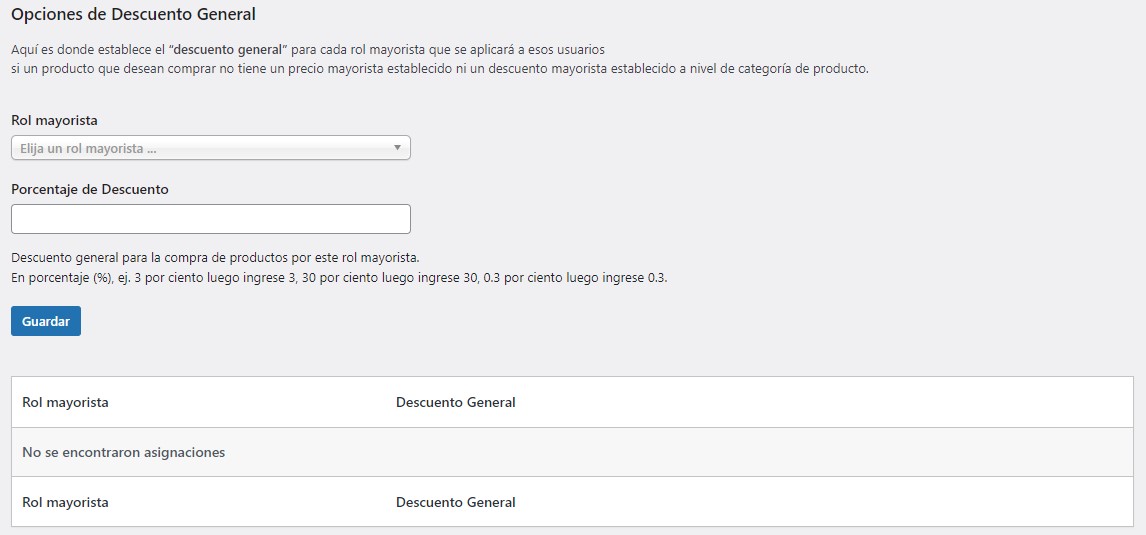 - Configuración general/global: La configuración General/Global se puede encontrar en TecnoCommerce > Ajustes > Precios al por mayor > Descuento. Este tipo de descuento mayorista basado en porcentajes se aplicará a todos tus productos que tengan un precio regular.