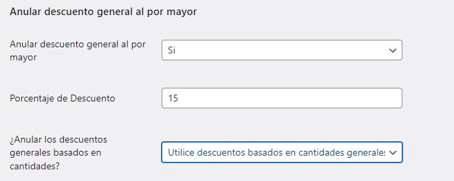 - Si tiene habilitado más de un descuento mayorista, hay un orden de precedencia que anula el otro descuento. El orden de prioridad (de mayor a menor) es Precio mayorista de producto individual > Precio mayorista de categoría de producto > Precio mayorista anulado por el usuario > Precio mayorista general/global.