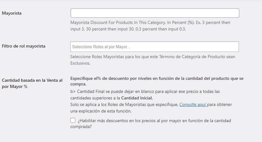 - Configuración de categoría de producto: Si desea aplicar precios al por mayor a categorías de productos específicas, también tenemos la opción de aplicar descuentos basados en porcentajes a la configuración de su categoría de productos.