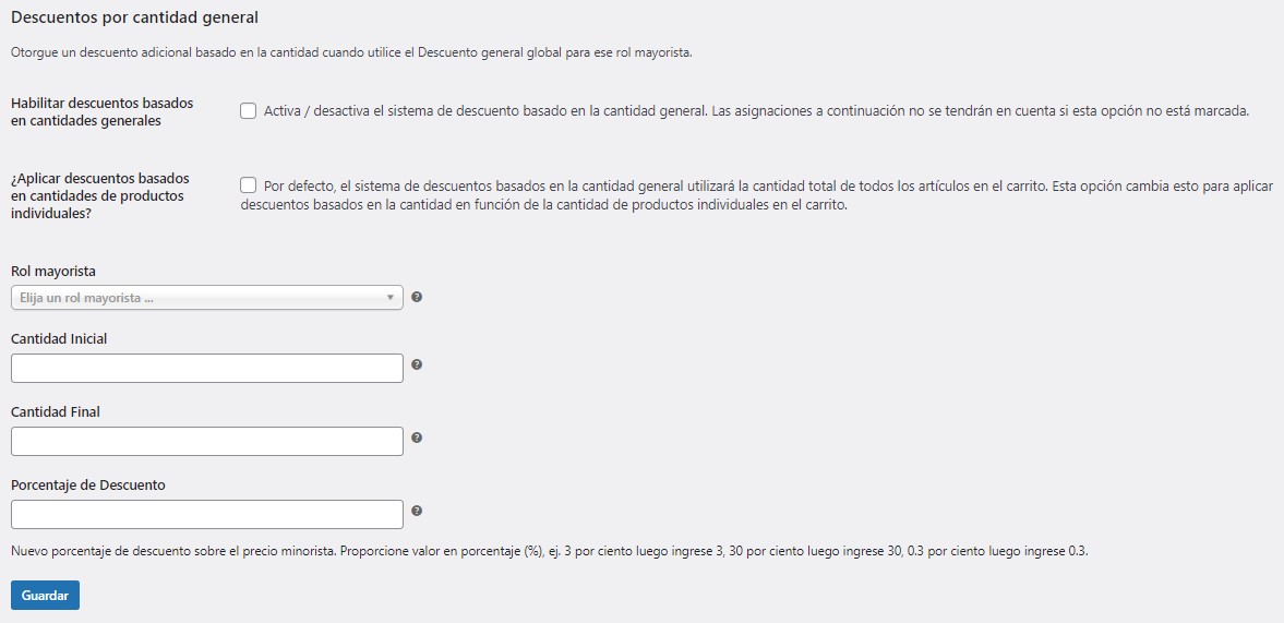 - Es necesario establecer primero el precio mayorista principal antes de que se aplique el des-cuento basado en la cantidad a sus productos. Por ejemplo, si tiene descuentos basados en la cantidad en la Configuración general, primero debe establecer el Precio mayorista principal en la Configuración general. Se aplica la misma lógica si tiene descuentos basados en la cantidad en la configuración de Categoría de producto, también debe establecer el Precio mayorista principal en el mismo nivel de configuración.