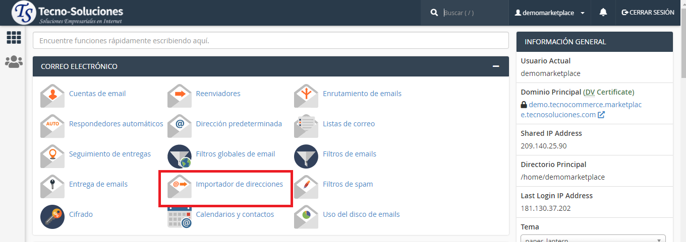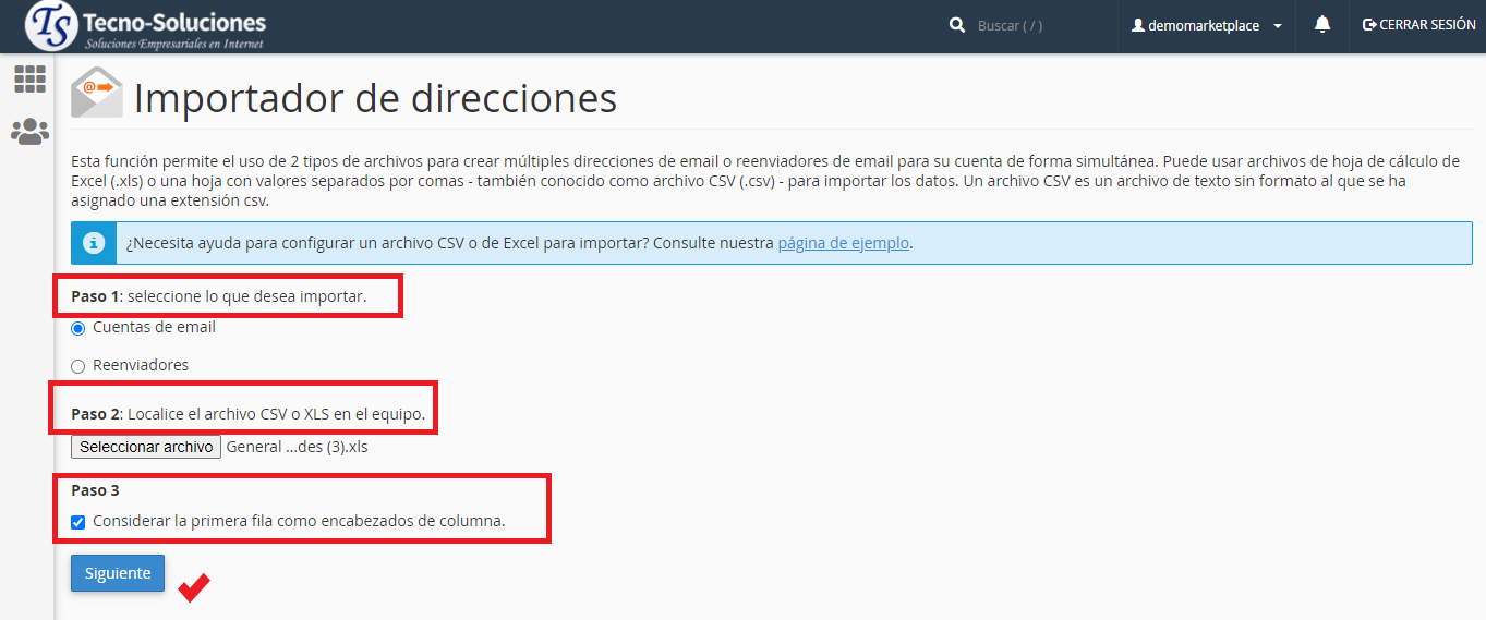 Importe el archivo para crear las cuentas. cPanel utiliza la información del archivo para crear todas las cuentas automáticamente.