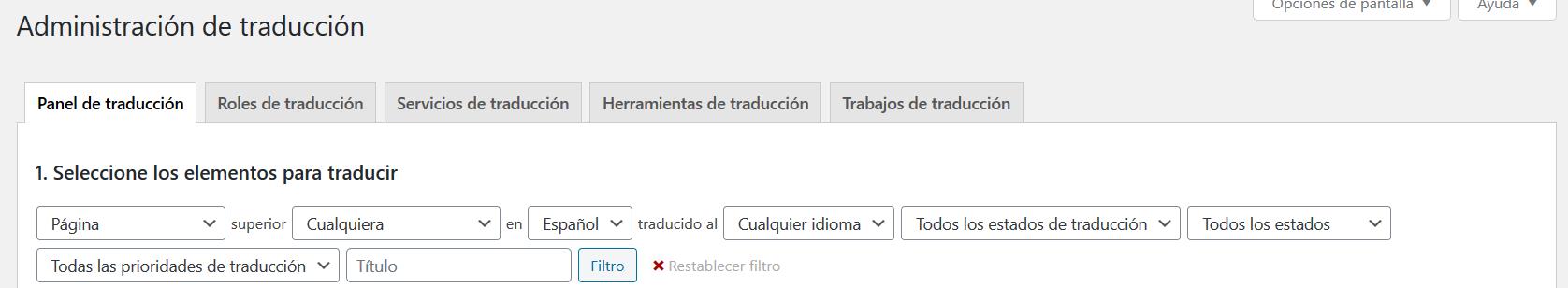 Lo primero que muestra la página son una serie de filtros que nos permitirán seleccionar los parámetros necesarios para ubicar las frases que deseamos traducir: