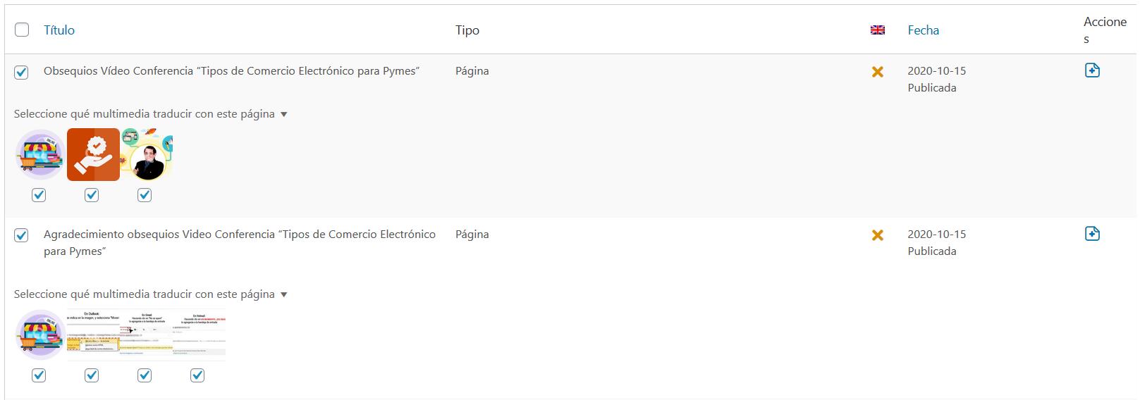 Luego nos presenta la lista de frases disponibles para traducción donde debemos marcar las casillas de las frases e imágenes que deseamos traducir (las imágenes se muestran luego de haber marcado la casilla de una frase):