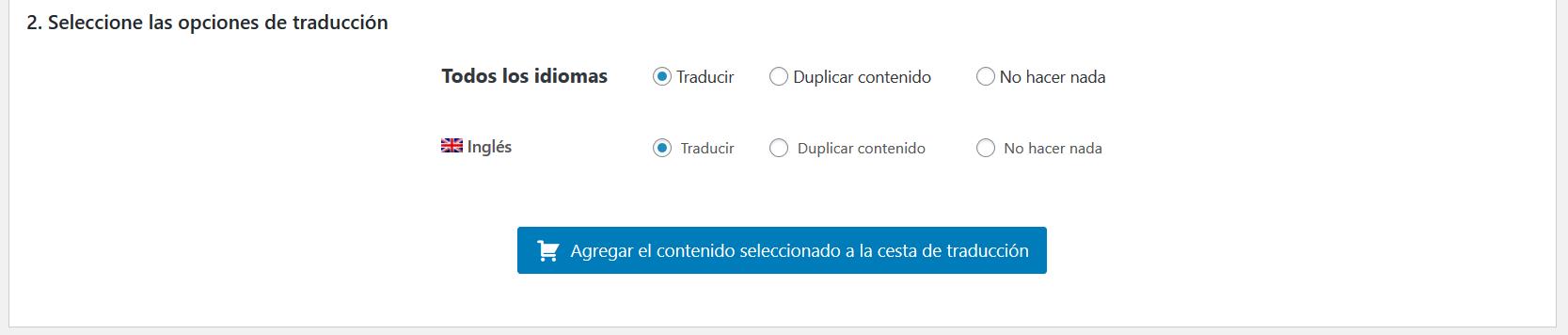 Finalmente, nos muestra las opciones de traducción y el botón para Agregar el contenido seleccionado a la cesta de traducción: