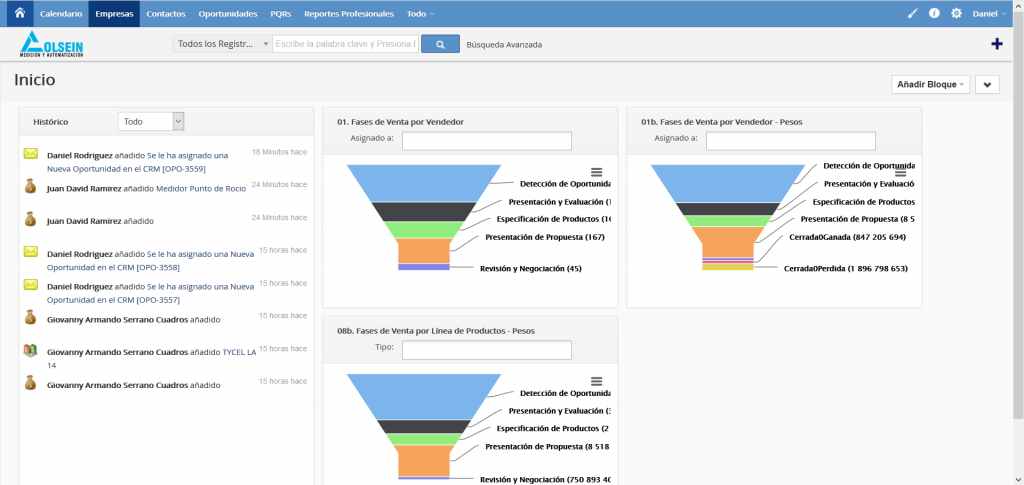Una vez que el usuario y contraseña se han ingresado correctamente a través de la página de ingreso, se presenta la página de inicio del sistema TecnoCRM.