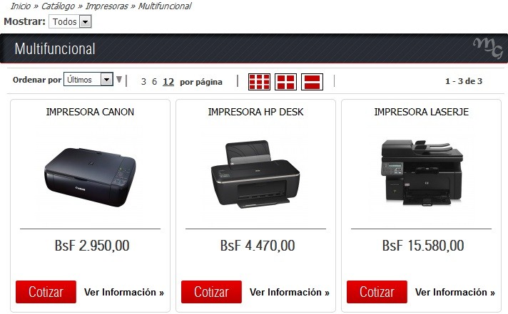 Al seleccionar una categoría del menú (o del bloque central) aparece una página con las sub-categorías (en forma gráfica) correspondientes (de aplicar). Vale decir que las subcategorías pueden tener otras categorías, conformando varios niveles de clasificación de productos.