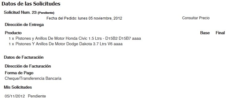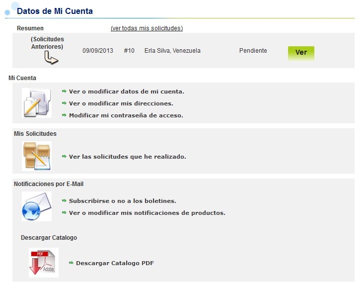 Resumen / Pedidos Anteriores. Muestra inicialmente un resumen de los pedidos recientemente realizados con fecha, número, estatus y monto, al hacer clic en “ver” aparece una página con los detalles del pedido seleccionado, tales como: Número de Pedido, Estado, Número de Factura, Fecha, Monto Total, nombre y cantidad de Productos que conforman el Pedido con sus respectivos Precios, Dirección de Entrega, Datos de Facturación y Forma de Pago.
