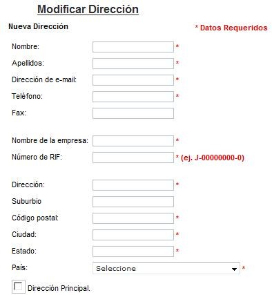 Cabe destacar, que la dirección que se determine como Principal es la que el sistema seleccionará por defecto para el envío y para la facturación de los pedidos, también se utilizará para calcular los impuestos que le corresponden, al menos que se indique lo contrario en el momento de realizar una compra.