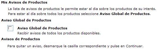 - Ver o Modificar mis Notificaciones de Productos: Permite que el cliente pueda recibir emails o mensajes personalizados cuando se incorpora alguna novedad sobre todos los productos de la tienda (marcando la opción “Aviso Global de Productos”) o sobre un producto específico cuando así sea previamente establecido (la activación por producto se hace en la hoja de datos del mismo).