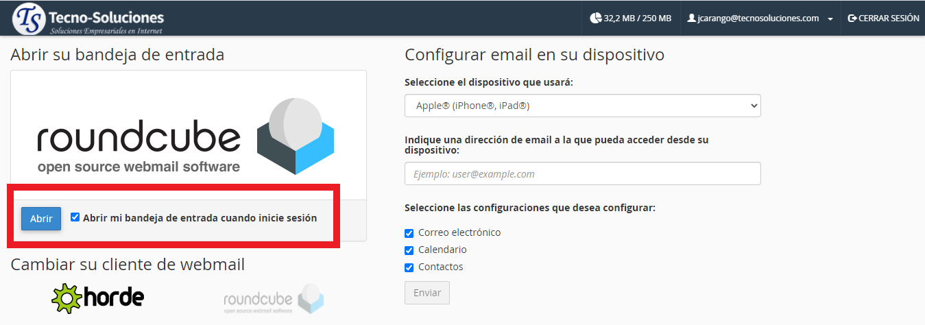 Esta sección le permite abrir la bandeja de entrada de su cliente de Webmail. Haga clic en Abrir para abrir la bandeja de entrada del cliente de correo seleccionado. Para abrir su Bandeja de entrada cada vez que inicie sesión en Webmail, seleccione la casilla de verificación Abrir mi bandeja de entrada cuando inicie sesión.