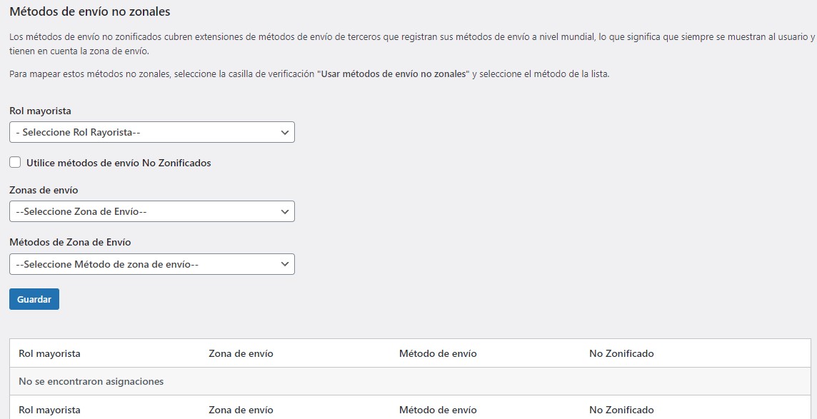 Cuando se detecta un usuario mayorista en el carrito o en el pago, el complemento se refiere al mapeo que configuraste en esta interfaz para determinar qué opciones de envío deberían ver.