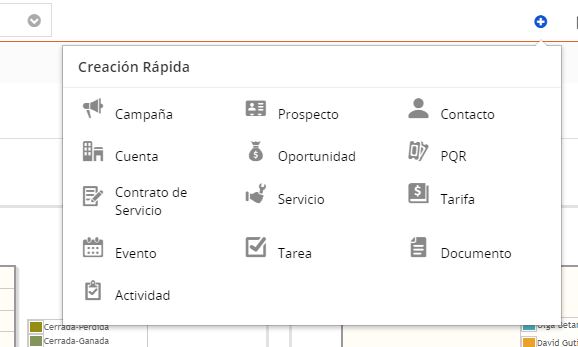 Al lado izquierdo del buscador se encuentra un menú rápido el cual se despliega haciendo clic en el símbolo de + y permite crear diversos elementos tales como: Cuentas, Tareas, Campañas, Contactos, Prospectos, Oportunidades, Eventos, PQRs, etc.