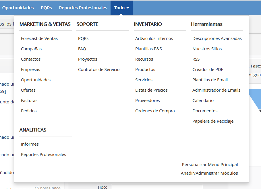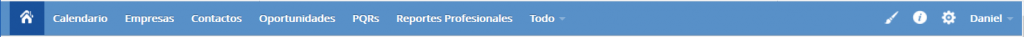 En el tope de TecnoCRM es posible navegar a través de todas las funcionalidades y áreas existentes: