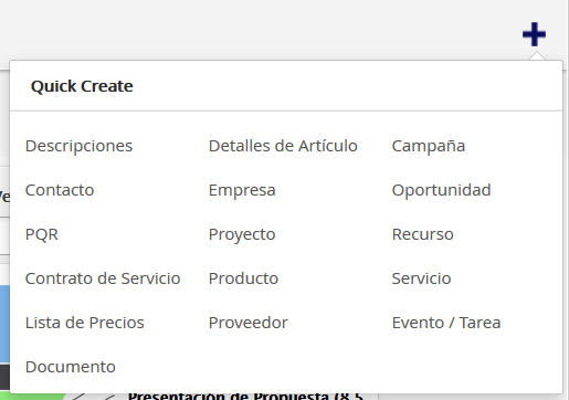 Al lado izquierdo del buscador se encuentra un menú rápido el cual se despliega haciendo clic en el símbolo de + y permite crear diversos elementos tales como: Cuentas, Tareas, Campañas, Contactos, Eventos, Tickets, etc.